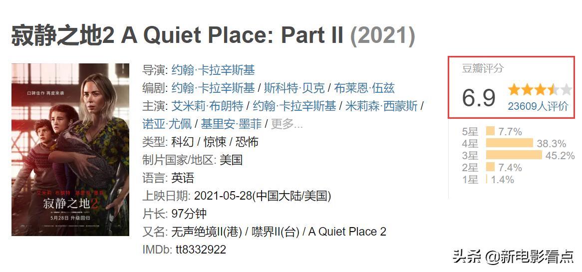 《寂静之地2》豆瓣打出了6.9分,这个分数不算高也不算低。观众打出的分数比较符合影片的质量。电影确实有着不错的惊悚恐怖感,但设定确实不够到位。