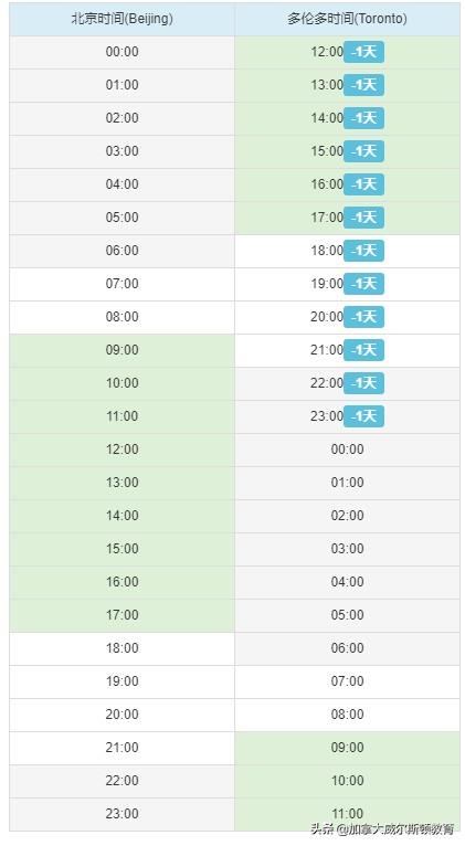 正常情况下,北京比多伦多晚13个小时。从2007年开始,加拿大遵从北美夏令时标准,每年3月第2个周日开始夏令时并把时钟往前调1小时,每年11月第1个周日结束夏令时并把时钟往后调1小时。下面是多伦多实行夏令时与北京的时间对照表,请大家参考。