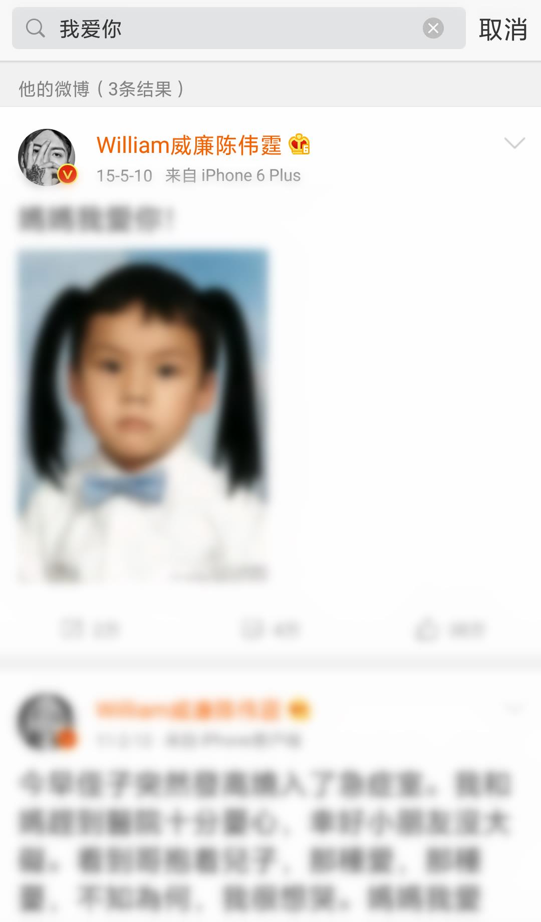 1.在陈伟霆的微博上搜索“我爱你”,显示有三条结果,但只有两条微博,也就是说有一条被隐藏了!