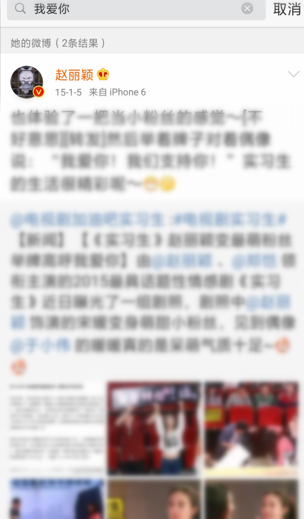 2.同样,在赵丽颖微博下搜索,有两条结果,只有一条微博,也有一条被隐了。