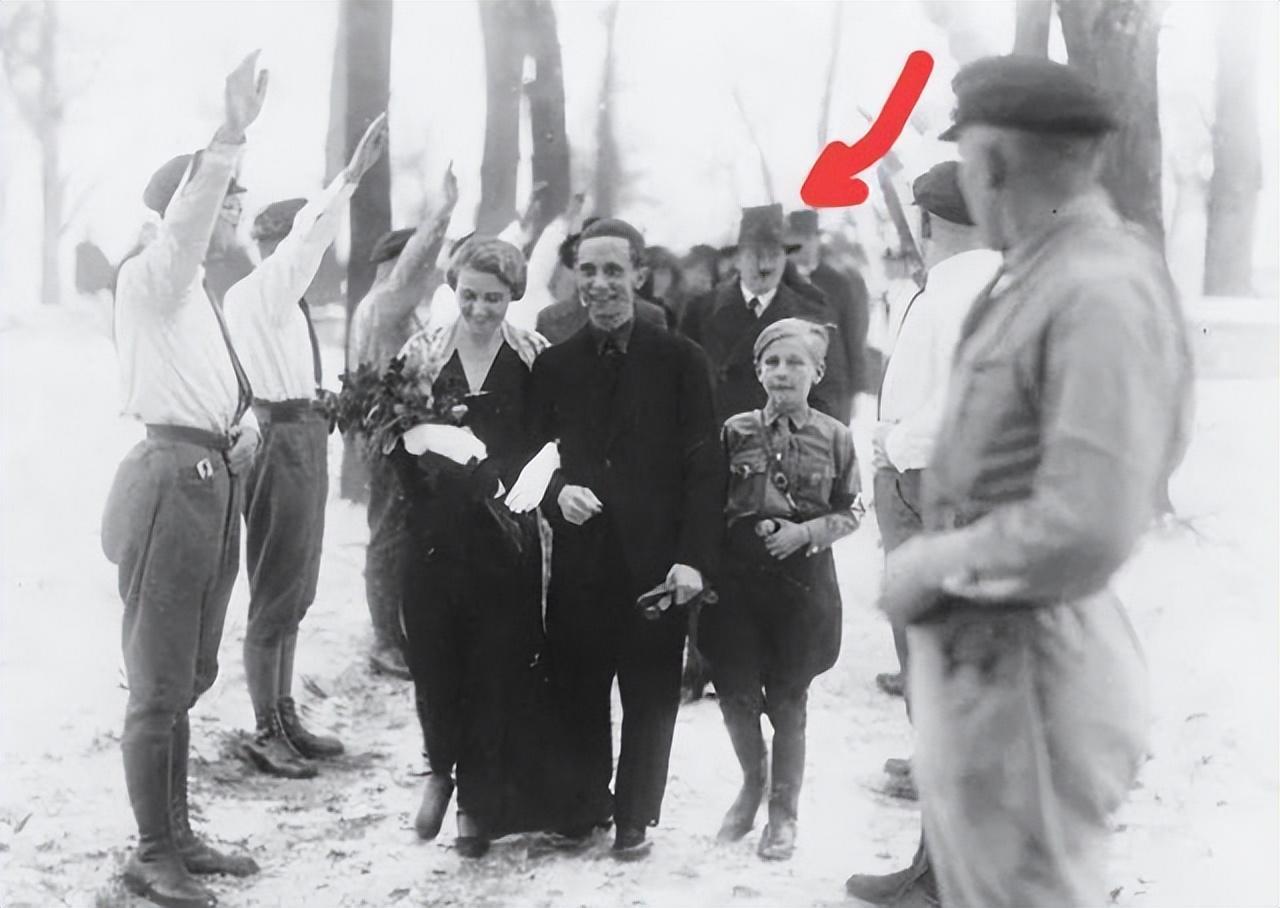 玛格达与戈培尔结婚典礼,旁边的小孩是玛格达与前夫所生的孩子,红色箭头为希特勒