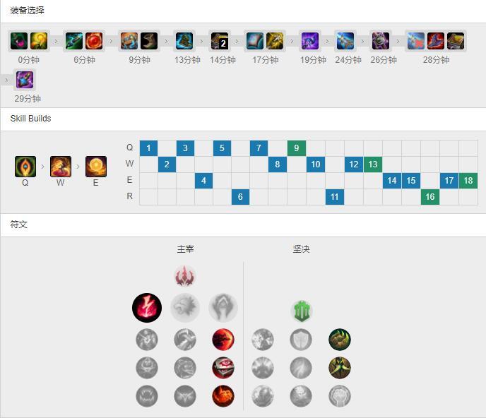 在战绩查询网站op.gg上可以看到Perkz近期洛战绩13胜3负,胜率高达81%,他天赋选择了主宰和坚决两系,出装一般以海克斯腰带起手。下图是Perkz一局打到比较后期的洛的出装加点示意图,大家也可以试着自己玩玩看哟。