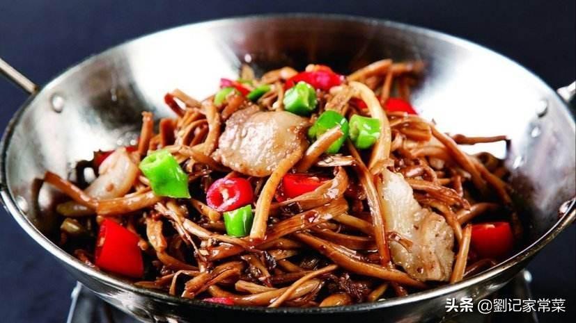 2.锅内加油,放豆瓣酱,干辣椒段,排骨,茶树菇,黑木耳,煸炒片刻,加鲜汤,盐,味精,小火煨至汤快干时,淋红油,撒上葱花段即可。