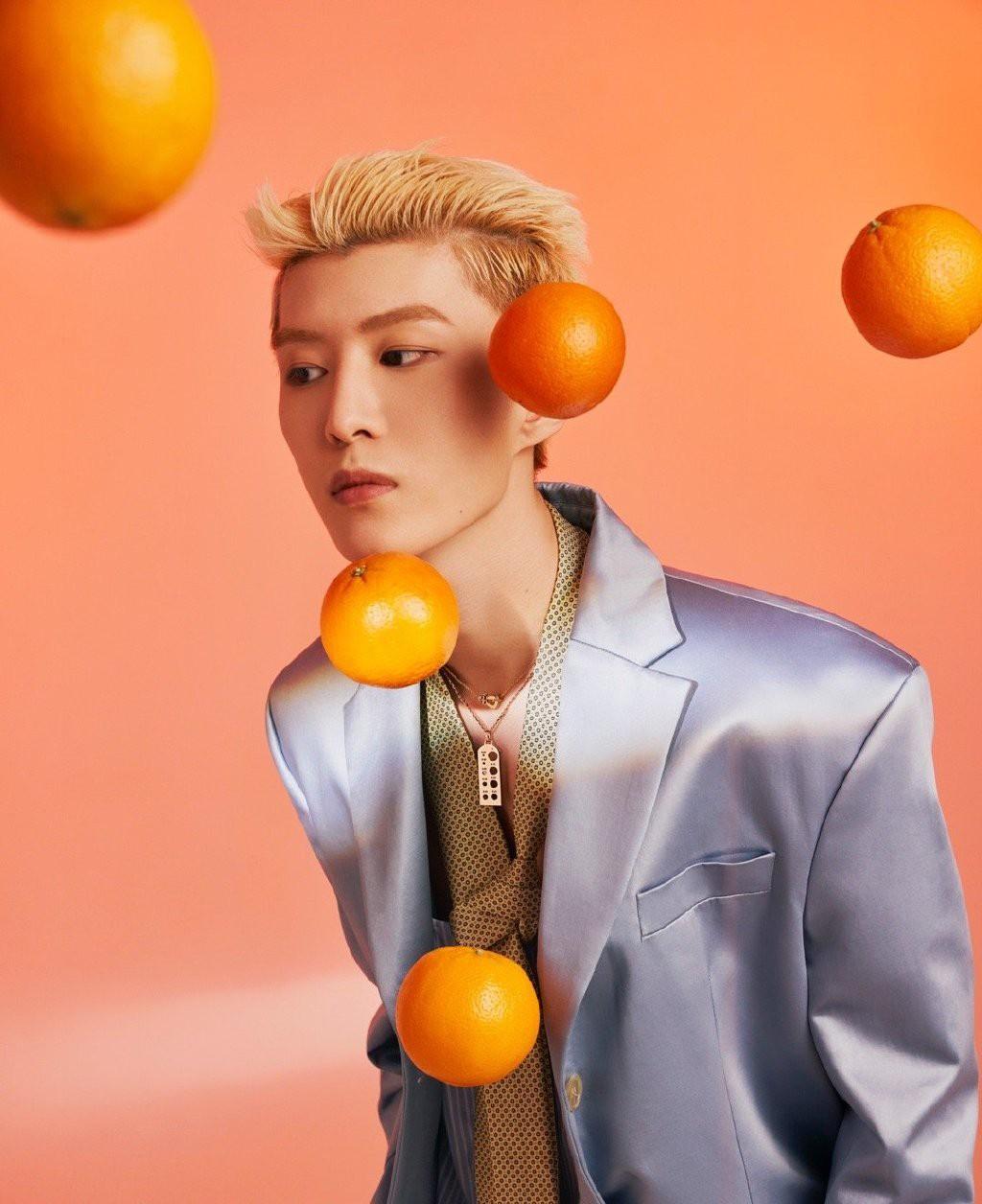 范丞丞身穿蓝色西装外套搭配上一个金色的印花波点领带,整个人看起来非常精致,有种职场精英的既视感,黄色的大橙子感觉也是恰到好处地完美中和了身上那种冷峻的气质,显得更加温柔。