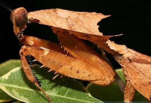 枯叶螳螂,来自马来西亚,外形酷似一片枯叶,这一层枯叶伪装,可以使枯叶螳螂更好的觅食和躲避天敌,枯叶螳螂可以说是奇特与美丽的结合体。它的胸部恰似半片枯叶,一对翅膀收拢后,看上去就更像一片完整的枯叶。枯叶螳螂的腿也恰似残叶叶柄,连“叶脉”和“叶经”都清晰可见。枯叶螳螂是大名鼎鼎的拟态猎手。