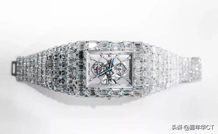此外,这款手表还镶嵌着价值100克拉的长方形钻石,散发着轻松自在的奢华和优雅气息。