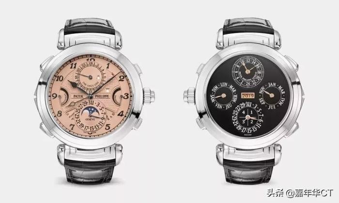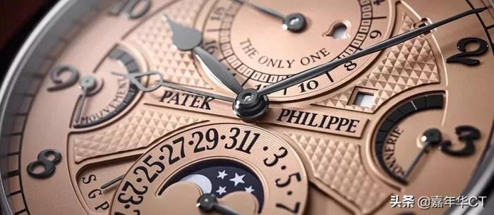 鲑鱼色的前拨盘在12点钟的闹钟表盘上刻有“唯一的一个”字样,是百达翡丽生产的最复杂的手表。