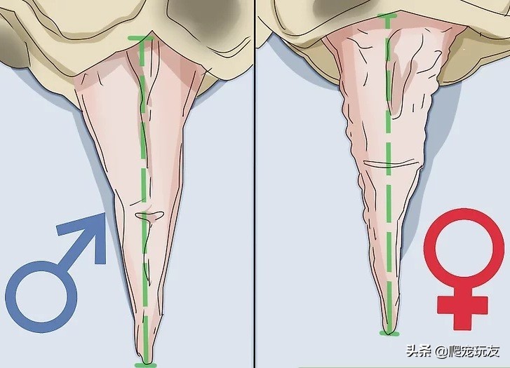 2.看乌龟的泄殖腔。雄性和雌性的尾巴下方都有一个开口这叫做泄殖腔,它的位置根据性别略有不同,雌性的泄殖腔比雄性的更圆,更像星星,位置更接近她的身体,在她的尾巴底部, 雄性的泄殖腔更长,更像裂缝,它位于尾巴的后三分之一处,朝向顶端。