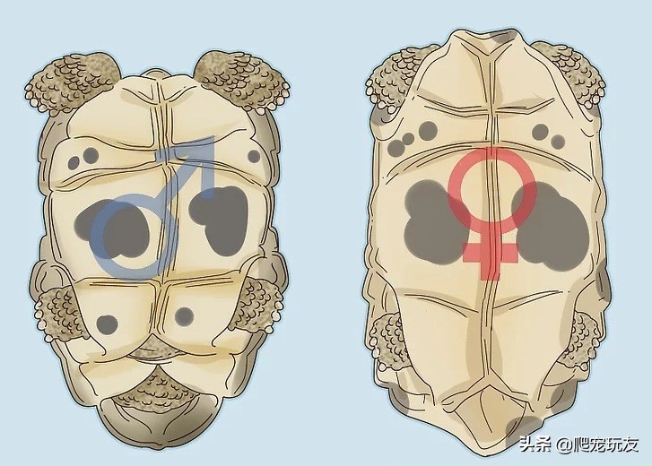 4.某些种群特有的特征。有些种类的龟具有性别特异性的外部特征。有些种群可以通过颜色来分辨性别,例如美国箱龟,90%的雄性箱龟有红色或橙色的虹膜,而雌性箱龟有棕色或黄色的虹膜。雌性通常有一个更高更圆的外壳,而雄性则有一个较低的外壳,更多的椭圆形。又比如太阳龟,如果腹部是蓝色的,那就是雄性龟,如果腹部没有蓝色,那就是雌性龟。