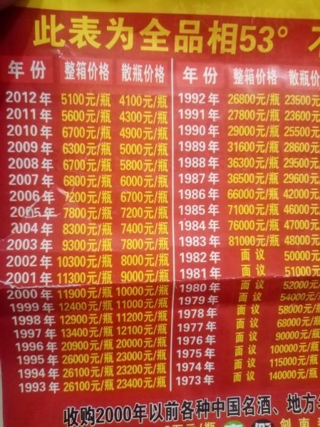 这是一个专业收酒的人给的各种年限酒价格,当然这上面价格相对低一点,但和实际价格差价不算太大,可以做参考用,像25年限的也就是1997年的大约是1.4万的价格
