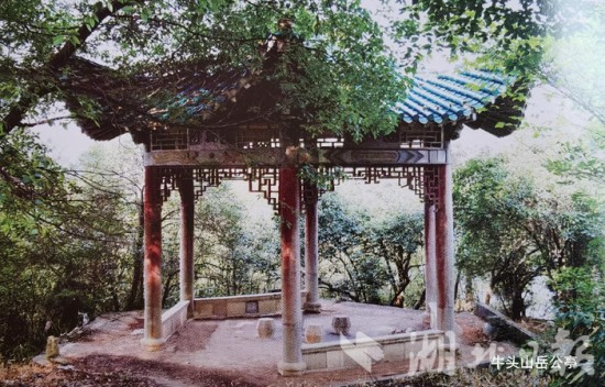 嘉鱼岳公楼,位于湖北省嘉鱼县鱼岳镇牛头山顶,距故址3千余米,主楼六边形体,钢筋混凝土框架仿木结构,通高42米,飞檐5层,六角攒尖楼顶,总建筑面积808平方米。2025年10月开工建设,2025年1月封顶、9月完工。从初建到今重建,时光过去了887年。是牛头山省级森林公园项目之一。