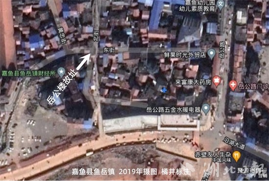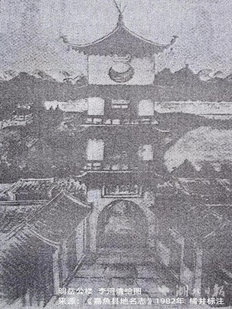 武汉黄鹤楼西南80千米,是同在长江南岸湖北嘉鱼县的县城鱼岳镇。作为县治历经1742年,几多人事景物随长江之水东流去。其中最有名的,当属老县城内东街与北街十字交汇处的嘉鱼岳公楼,屡建屡毁今又建。