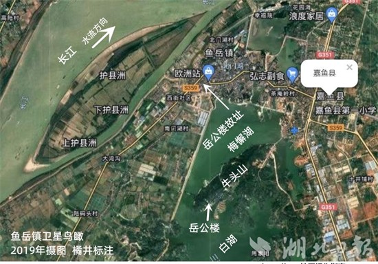 民国十年(1921)版《湖北通志》记载,宋绍兴五年(1135)二月,岳飞(1103—1142)奉南宋王朝皇帝旨,率军征讨实力十分坚强的杨幺起义军。当时,杨幺(1108—1135)水军在嘉鱼县蜀茶湖(县城东6千米,古时与长江连通)练军。岳家军在蜀山(县城东北12千米,滨蜀茶湖,今新街镇蜀港村内)筑城住兵布防,岳飞驻节县城内,搭建了瞭望用的“望楼”。后杨幺军,经长江撤回老巢湖南洞庭湖附近各地。