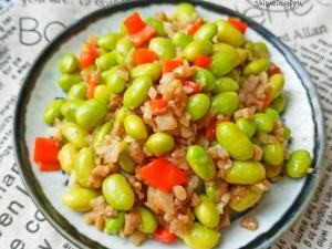 马上进入9月份了,这是一道8月份最该吃的菜,毛豆在这个季节成熟,再老就没法吃了,青豆是黄豆的“青春期”,颜色翠绿,植物蛋白丰富,和猪肉搭配在一起,口感好,味道好,下饭菜一流,先把青豆准备好,清洗干净,肉末里加花椒粉、五香粉,腌制去腥味,起锅烧油,下葱姜末,倒入肉丝煸炒变色,接着倒入青豆翻炒,加小半碗清水,焖煮3分钟,开锅淋入水淀粉,食盐调味,汤汁粘稠即可出锅。