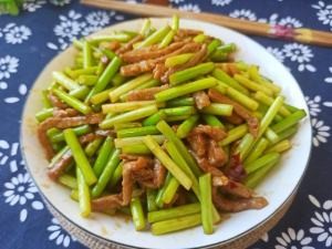 蒜薹是一种季节性的蔬菜,现在菜市场也有卖,多是冷库中存放的,保质期较长,很多人喜欢把蒜薹写成蒜苔,其实第一种才是正确的写法,蒜薹含有辣素,杀菌能力比较强,可以防止流感,避免体内生虫,准备适量的肉丝,放酱油、食盐、老抽、花椒粉,搅拌腌制一会儿,起锅烧油,先炒一炒肉丝,变色后捞出,重新起锅,加一勺豆瓣酱,翻炒出红油后,倒入蒜薹,断生以后,倒入肉丝回锅,最后加白糖、食盐调味,即可出锅。