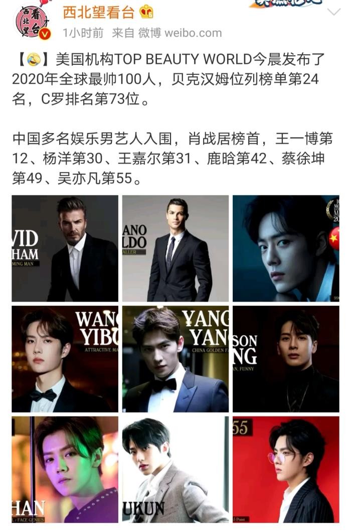 除了肖战外,还有6名中国男艺人上榜,王一博排名第12位,杨洋第30位,王嘉尔第31位,鹿晗第42位,蔡徐坤第49位,吴亦凡第55位。