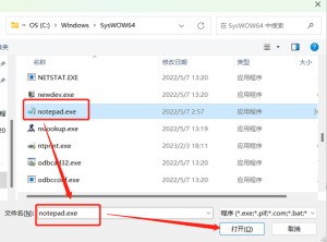 第七步,在SysWOW64这个文件夹里往下拉找到notepad.exe这个运行程序,点击选择后在下方打开