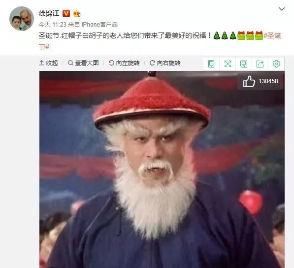 圣诞节"徐锦江撞脸圣诞老人"登上热搜榜,“听说你们都在等待一个红帽子、白胡子的老人”加上徐锦江经典的豹子头剧照,在朋友圈和微博刷屏。