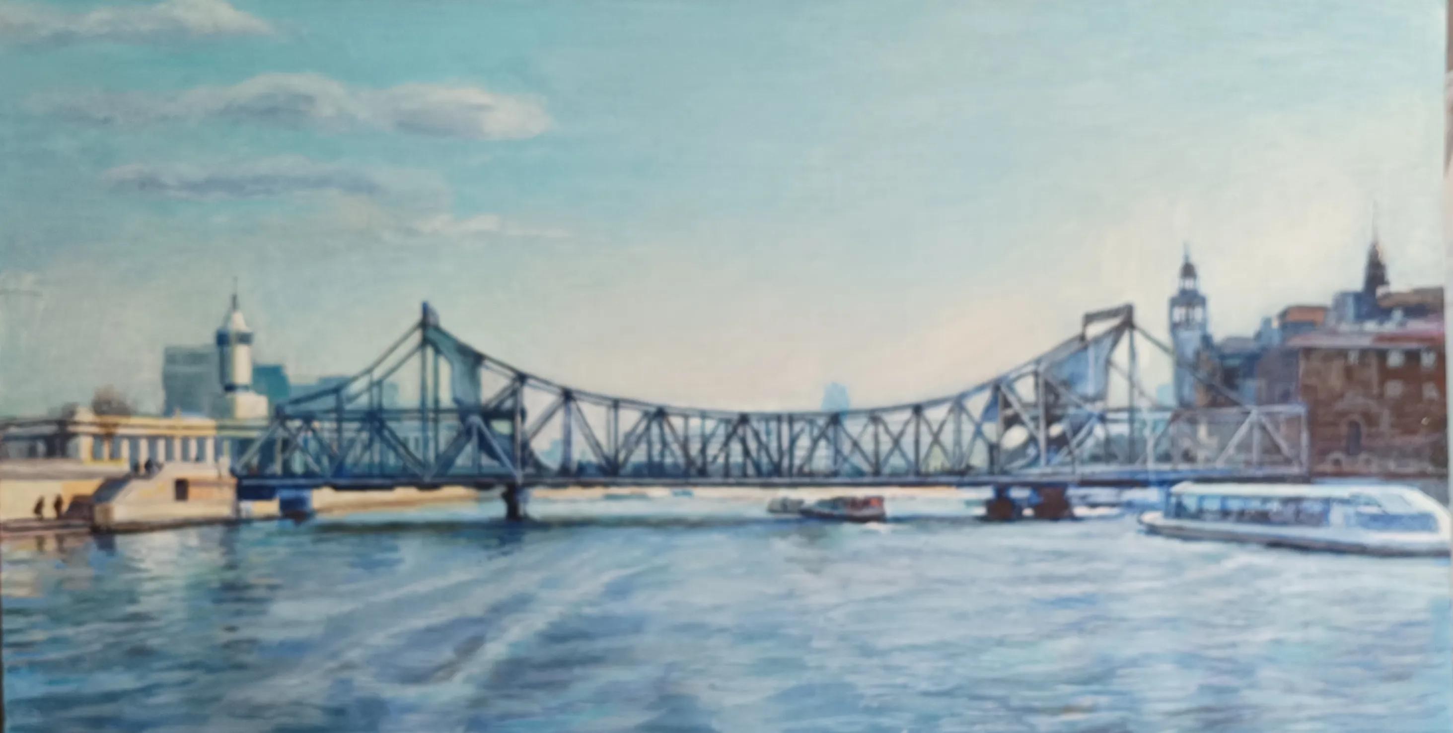 天津解放桥位于河北区三经路与和平区解放北路之间的海河桥梁,是可以开启的桥梁。是天津市标志性的建筑物,是连接河北区,和平区与天津站的枢纽桥梁,起名“万国桥” 。 我小时候家就住在四径路,离解放桥很近,每当有大轮船要从桥下通过时,就会响起汽笛声,我们小朋友就会跑出来看开桥的壮观场面。 天津市在1949年1月15日解放的,当时我还在上小学,解放后有一天看见有很多新闻摄影纪者们,在解放桥北岸边补拍了一段令人难忘的激动“解放军在桥上会师”的历史镜头:“桥是开启的,接着,桥的两边都有全幅武装的解放军战士们,手握着钢枪,勇猛地冲上了开启的桥上,这时战士们就把开启的桥压下来了,战友们在桥上胜利会师,欢呼!跳跃!相互拥胞。这个镜头我一辈子也忘不掉。太壮观了! 解放桥在1927年建成,日本投降后八国联军英、美、法、俄、日、意、奥、比,共九个国家,在天津都有租界地。解放桥北岸:是意大利租界地,南岸为法国租界地。所以大伙都习惯把这桥叫,“法国桥”,据说是设计法国爱菲尔铁的设计师的作品,后来确认为美国芝加哥:布施尔泽尔桥梁公司设计方案,史料虽然有不少,就是没有设计者的名子。一直是不好查证。日本投降后,当时这桥还用了蒋介石的名为;“中正桥”解放后才改为“解放桥"在天津发生了多少事让我们永远记住,守住家园,决不允许外国列强再来我们土地上横行霸道。 建设好保卫好自己的家园是我们的责任。 现在发二张我画的解放桥原创油画和丙烯画.请朋友们点赞关注。再见.