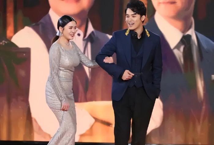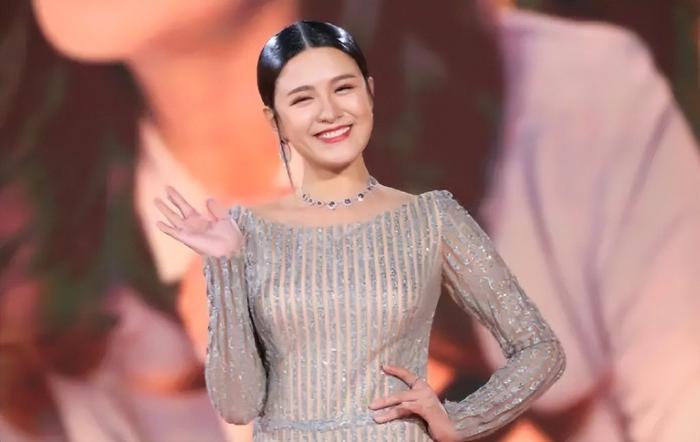 江嘉敏身上这款礼服,在款式设计上属于比较贴身的类型,尤其是腰腹部,看上去有点过于紧绷,腹部明显地凸起,侧面看上去有点减分。