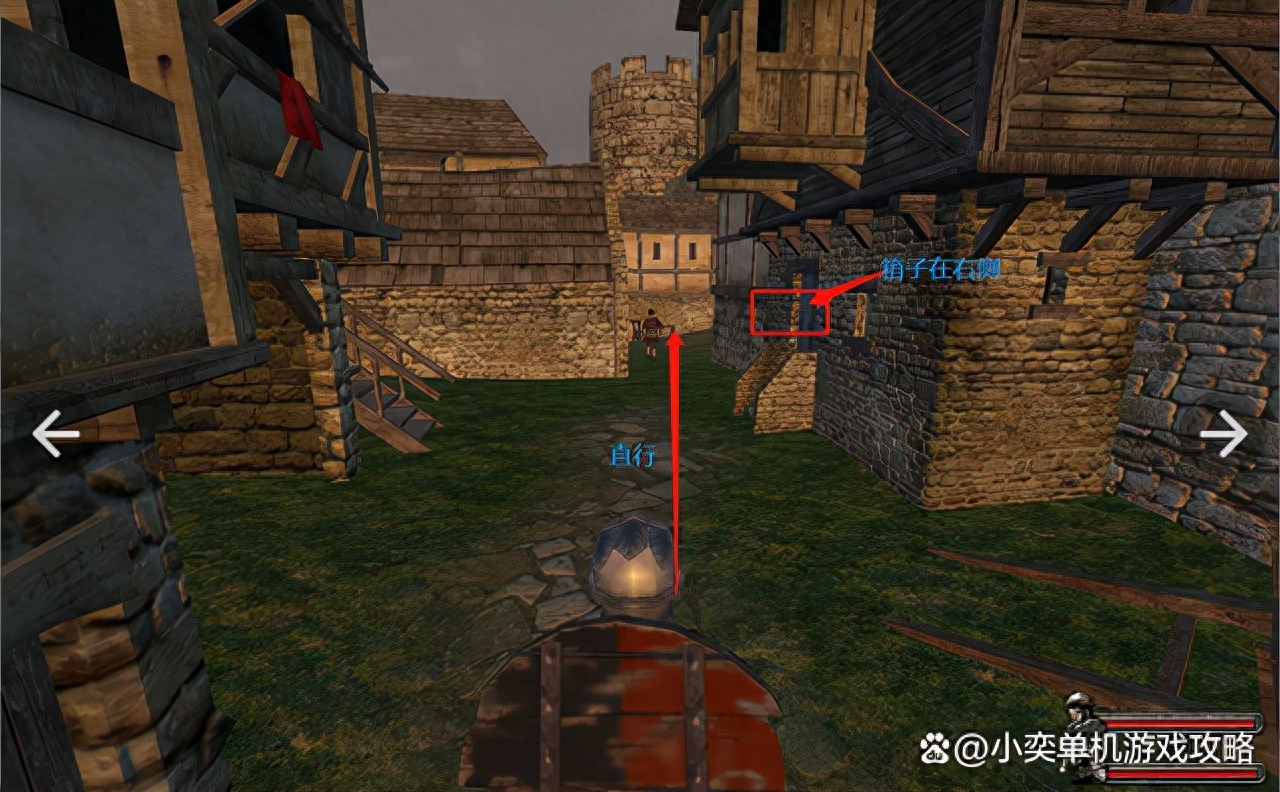 进城穿过第一道内城门,马上左拐,然后再右拐,看到一堆木头堆,从木头上右拐,箱子就在角落。