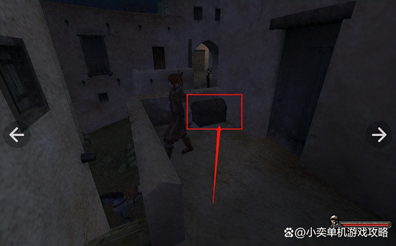 进城后走左侧楼梯,然后右拐,继续上楼梯,在中间有个柱子,绕进去,箱子在里面