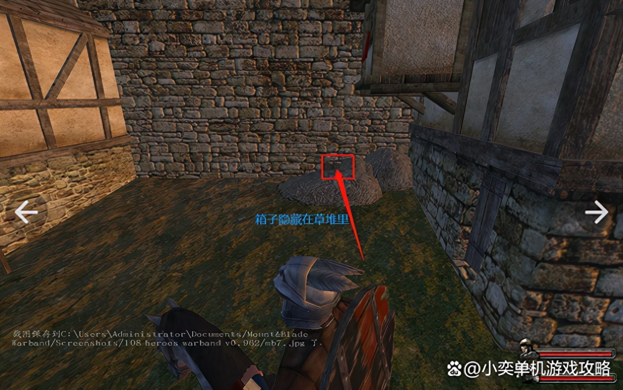 进城直行几步马上右拐,到岔路口左拐,然后直行到底,箱子隐藏在草堆里