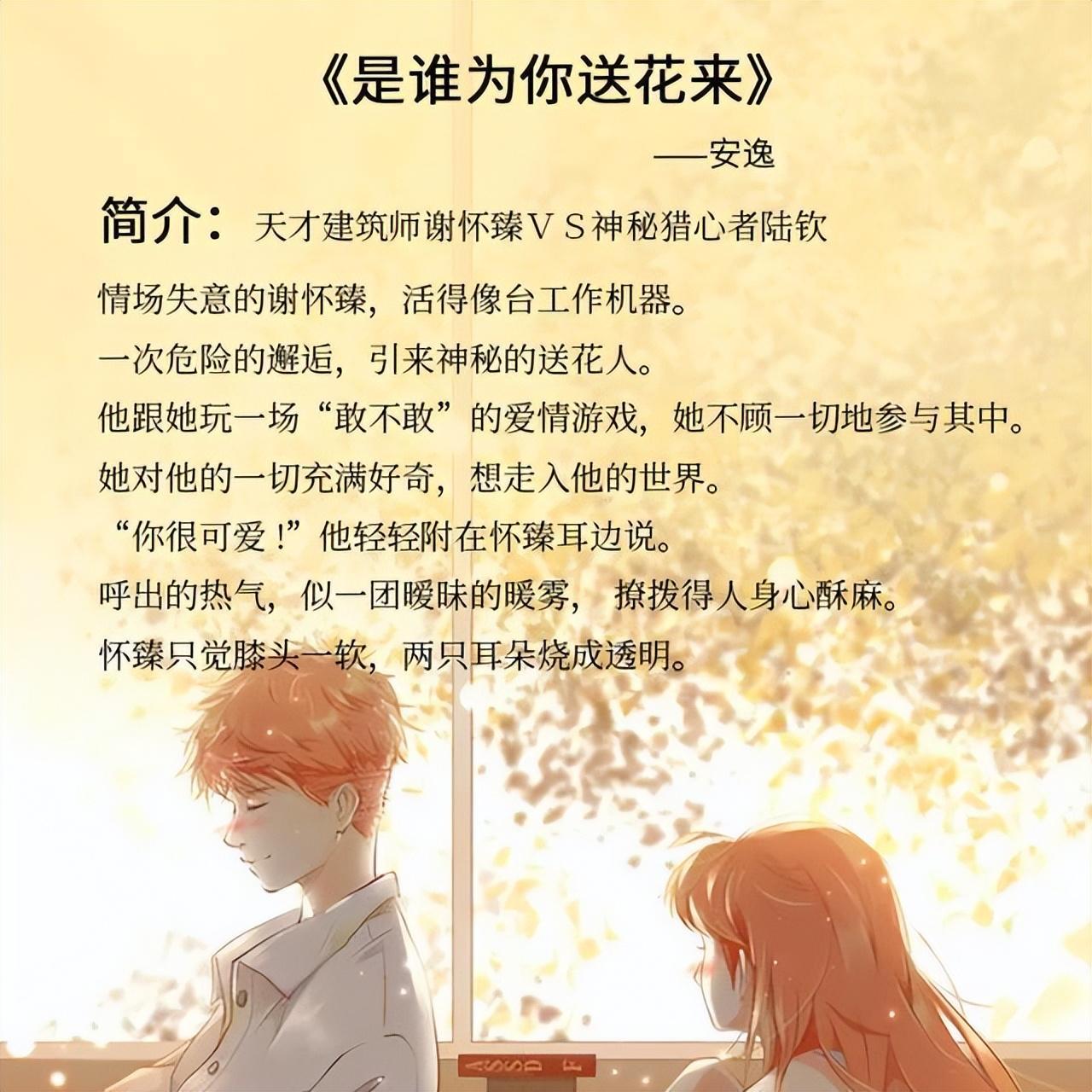短书评:美艳建筑师VS神秘送花人 这本真的是高甜的悬疑推理文了!一直无感悬疑推理的我,深深着迷! 女主是建筑天才,但是恋爱起来像个小女生, 她是人生从不出错那种,却拿男主没办法!彷佛能看到书边出现了爱的泡泡! 男主是禁欲型的!出场时候太神秘了,一开头两人在酒吧那段超级撩! 看到最后男主会有反转(这里就不剧透了)。 喜欢看甜宠文的小伙伴不要错过!!又甜又撩! 男主真的不停给女主送小花花呀,超级浪漫!