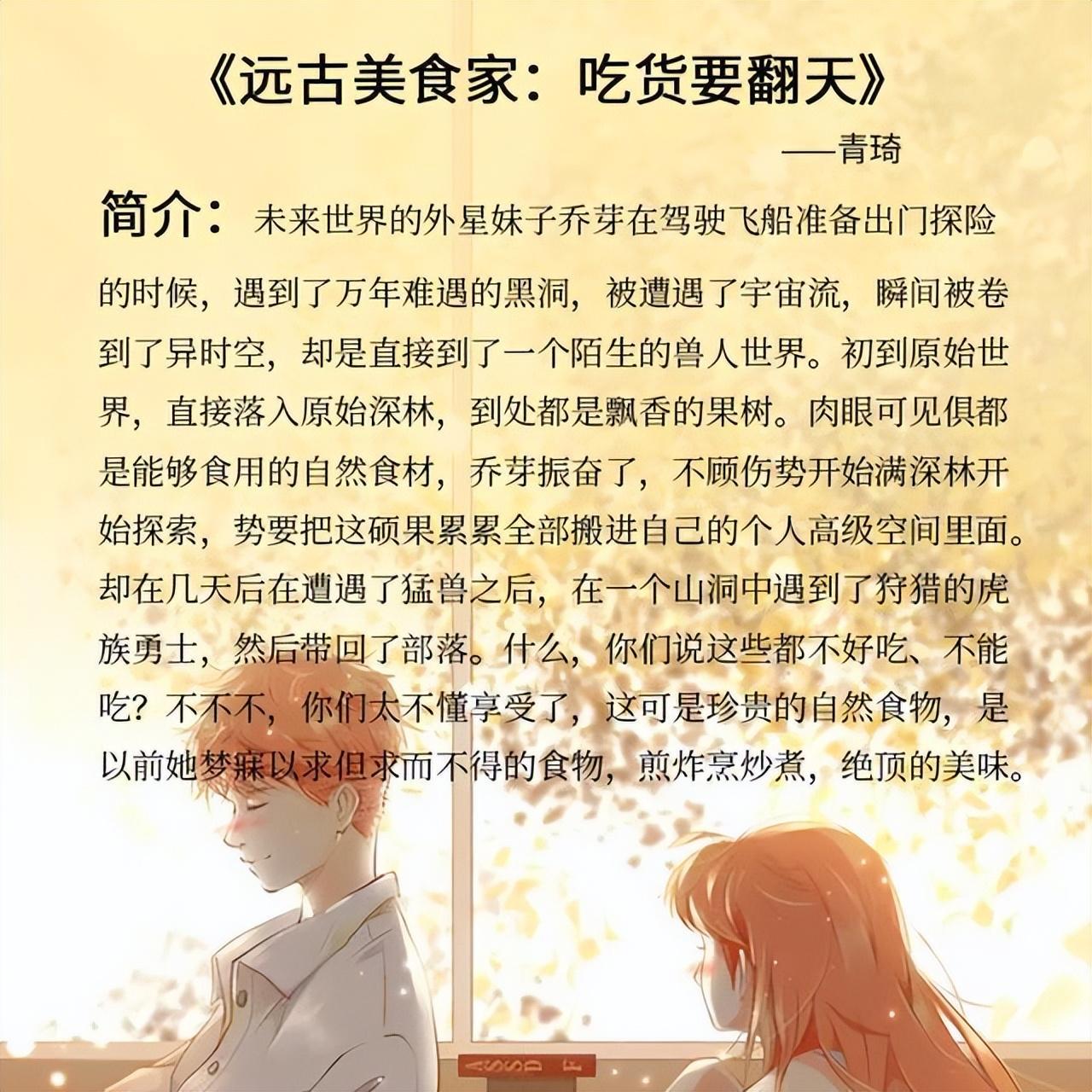 短书评:这是一个女主在蛮荒凭借美食打出一片天的种田文,在那种茹毛饮血的时空背景里,能就地取材做出各种美食的女主,简直是小天使。我个人是比较喜欢这种环境的设定的,觉得比较有趣,吃货到哪里都不能把自己饿着呀。