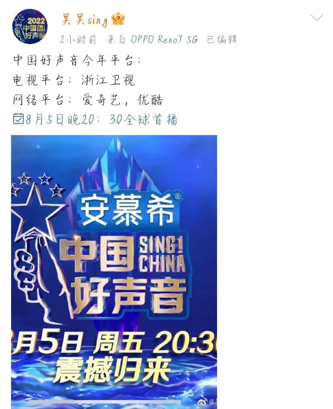 7月29日,浙江卫视大型综艺节目《奔跑吧》迎来最后一期节目,本期节目结束后,下周将播出2022年《中国好声音》,目前这档节目已经开始录制,将于8月5日起每周五播出,播出平台除过浙江卫视之外,网络播出平台已确定,两大平台联合播出,而今年腾讯视频不在内。