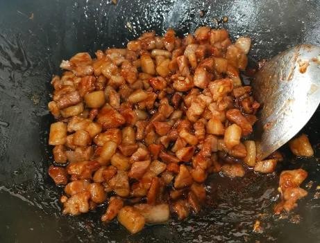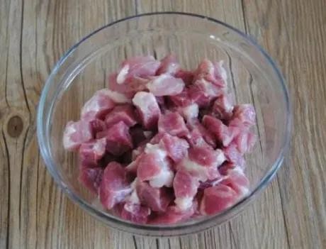 制作过程:第一步,首先准备出适量的猪肉,将其冲洗干净后,控水切成丁,炒锅置于火上,不用加油,直接放入切好的肉丁开始煸炒;