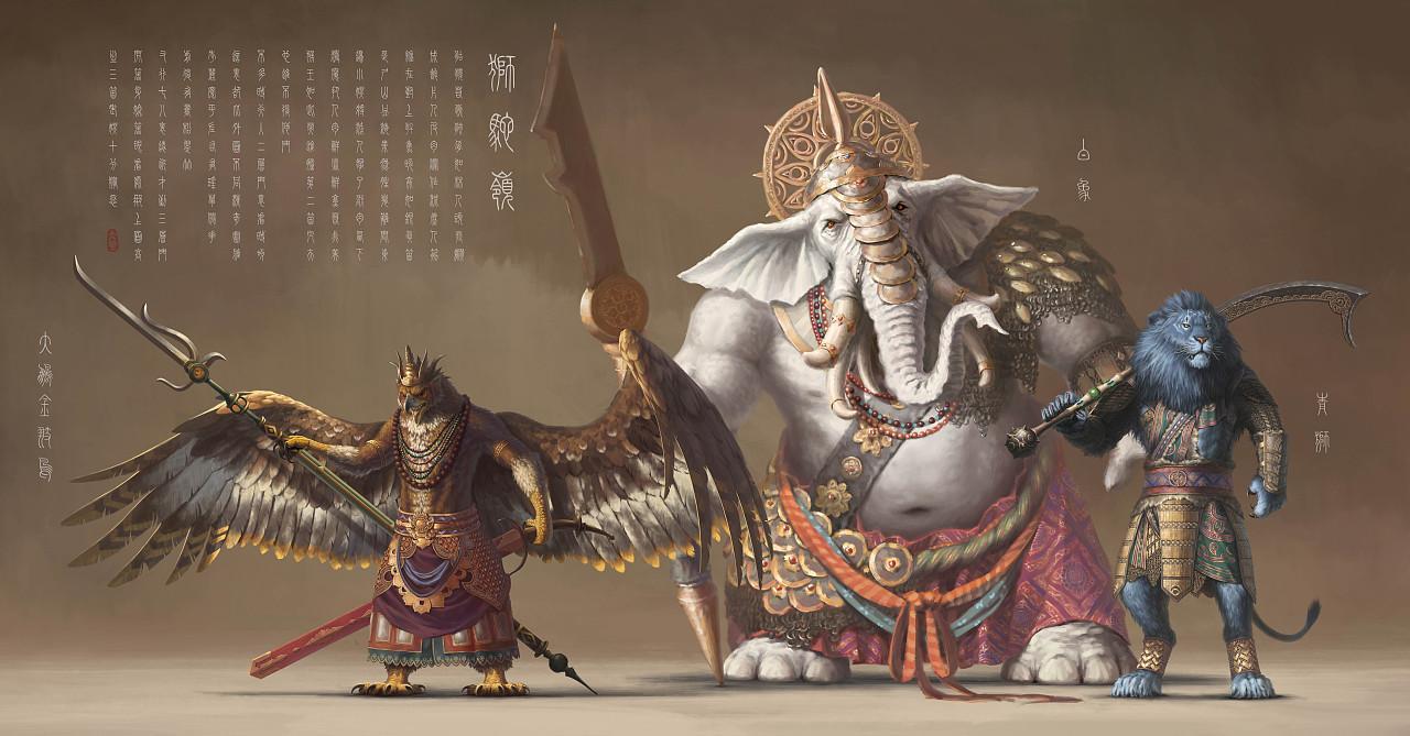 只见当中坐着三个老妖,中间乃是兽中之王青毛狮子精,长得面目狰狞,巨口尖牙,仰鼻朝天,赤眉飘焰,其声吼如雷,眼神如电;左边乃是黄牙老象精,长得身躯魁梧,长鼻黄牙,其声音如淑女,长得却像恶鬼;右边乃是大鹏金翅雕,长得鹏头金翅,利爪骇人,其老谋深算,老奸巨猾。