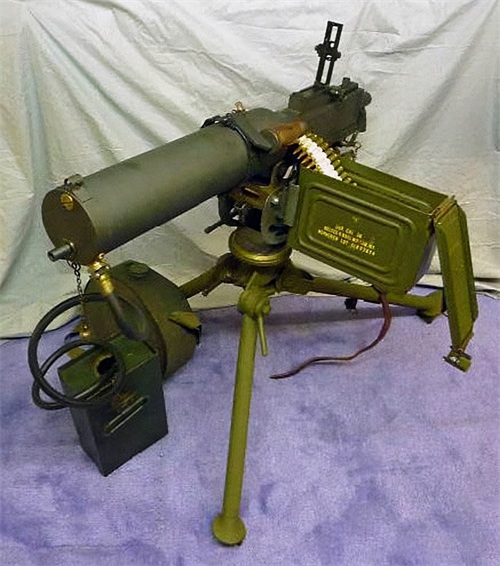 该枪早在一战期间就已经在使用,借鉴了马克沁的水冷式散热结构,但它并不属于马克沁系列武器,而是勃朗宁系列机枪中的一员。M1917除了水冷散热外,其他的地方都与马克沁不同,采用枪管短后坐式原理,在击发弹药的同时,枪管会向后伸缩,不但降低后坐力,也能提升枪身的稳定度。M1917发射7.62x63mm步枪弹药,使用帆布制250发弹链供弹,有效射程为1000米,最大射程为5000米,射速为每分钟600发左右。M1917A1型是优化型号,减轻了枪身不必要的重量,而且还在水冷散热的基础上,加装了制冷系统,一根制冷管连接在枪管的水桶上,下面连接着制冷液,散热效果要比传统的马克沁还强,不过M1917A1只在二战早期的陆战队使用过,后来都被更先进的M1919A4所代替。