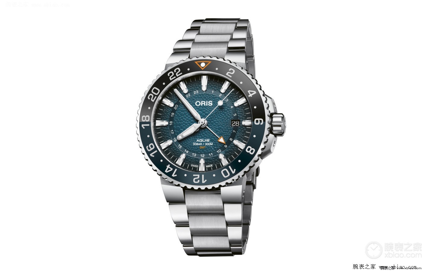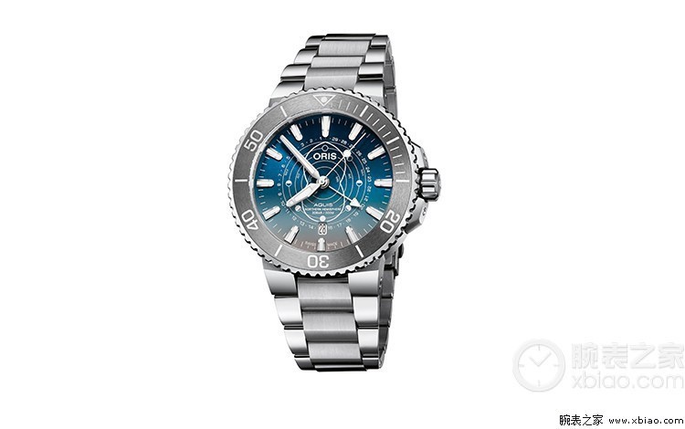 这枚腕表采用43.5毫米不锈钢表壳,并配有双向旋转蓝黑色相间的陶瓷表圈,在配色上非常和谐。腕表表盘采用深海蓝色,盘面上绘有鲸鲨身上的斑点纹,别具匠心。除了出色的外观,这只表还配备了24小时制第二时区指针、瞬跳日历、以及停秒等功能,非常实用。腕表搭载的Oris 798自动上链机械机芯能够提供42小时动力储存,防水深度300米。