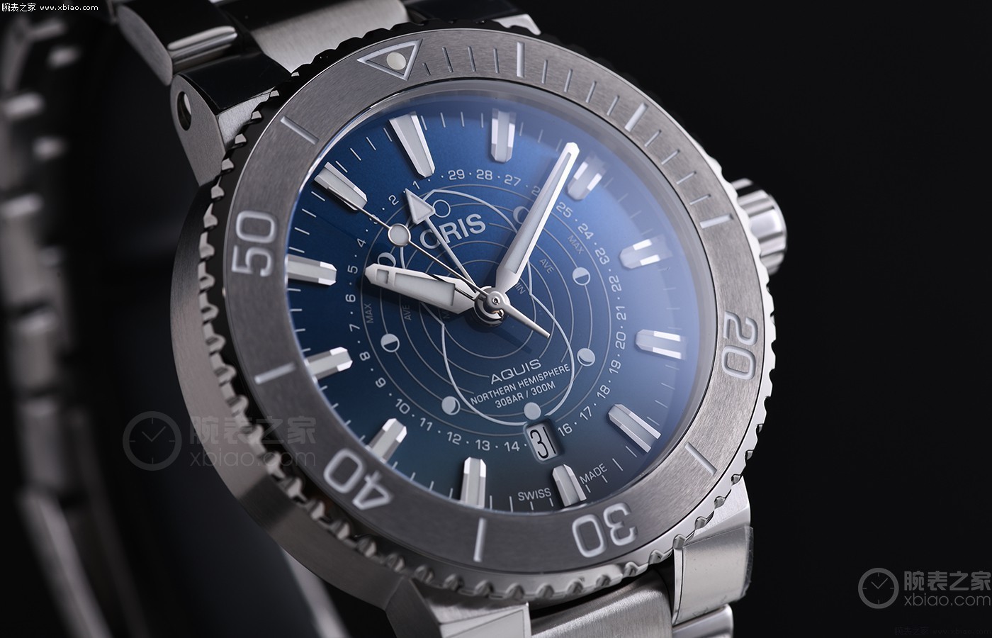 盘面上交叠的线条是其实是指针式日历,它是由豪利时与专业潜水员共同研发的,可以同时显示北半球的月亮运行周期和潮差。这款腕表的设计是以豪利时Aquis潜水腕表为原型,43.5毫米的精钢表壳搭配灰色表圈,表壳侧面采用了拉丝工艺处理大漠,呈现金属的特殊质感。腕表限量2009枚,官方售价18,300元,还是颇具性价比的。