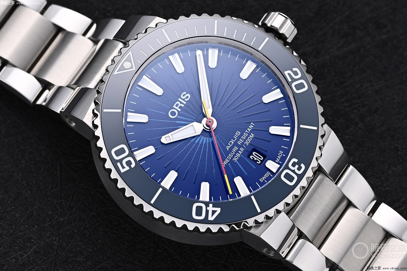 该款腕表有 41.5mm 和 36.5mm 两种尺寸,照顾到了想入手潜水表但手腕较细的表友。除此之外,两款腕表都搭载不锈钢表壳和单向旋转的潜水表表圈,以及耐磨防刮的灰色陶瓷表圈刻度。腕表搭载了一枚Oris 733自动机械机芯,可提供38小时动力 储存,防水深度300米。