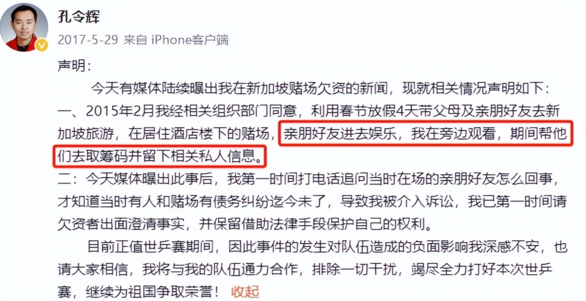 5月份,孔令辉因为进入赌场问题,被中国乒协暂停教练职务。