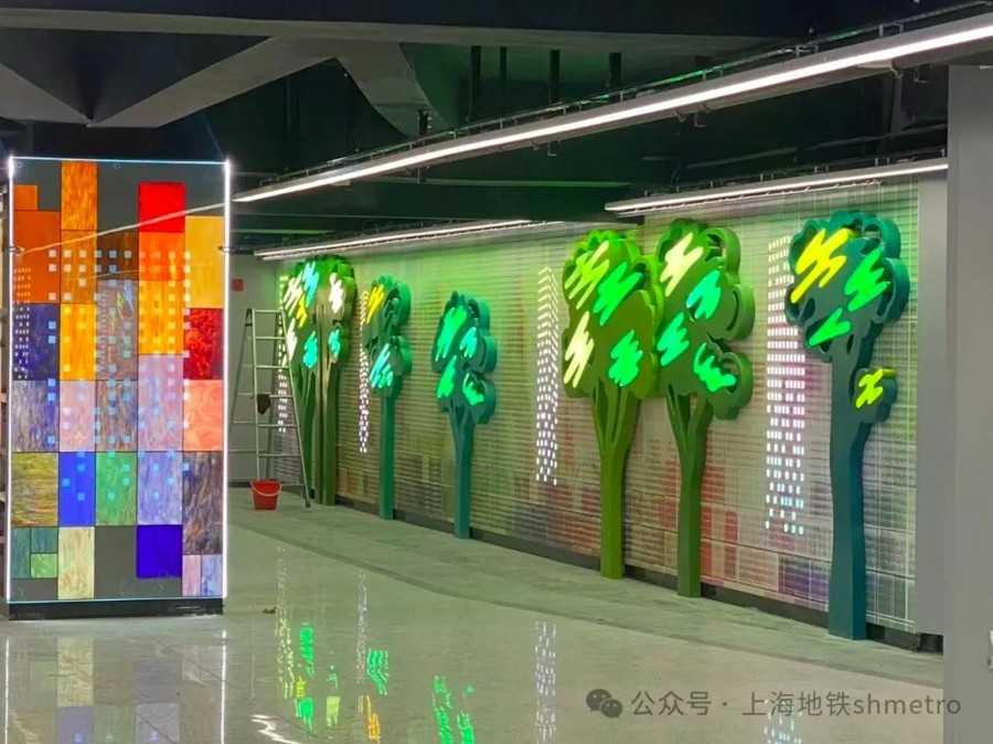 换乘通道在设计上利用既有空间格局,在平均宽度仅10米左右的通道内,配备了无障碍电梯、空调系统、卫生间(含第三卫生间)等服务设施。通道西头连接15号线出入口的近180米段空间为沉浸式公共艺术空间,在春节、中秋、国庆等一些重大节假日,会开启灯光秀假期模式,呈现出层次丰富的视觉体验。