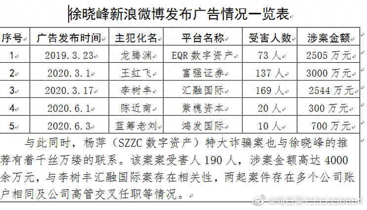 此外,赵华寻找受害人时发现,徐晓峰至少为5起网络金融诈骗案件“站台”。每起案件的受害人数少则数十人,多则百余人,涉案金额上千万元,涉及的平台包括EQR数字资产、富强证券、汇融国际、紫槐资本、鸿发国际等。