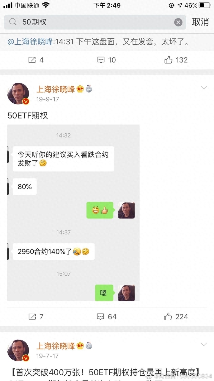 2020年10月,赵华曾向上海相关部门举报。2020年12月前后,徐晓峰微博内的大部分广告已被删除。现仅能找到其中2条,“准不准用实力说话,看图。想要开户加客服微信。”在广告中,徐晓峰如此介绍,其中一张截图显示,一天时间50ETF软件的收益达12.4万元。