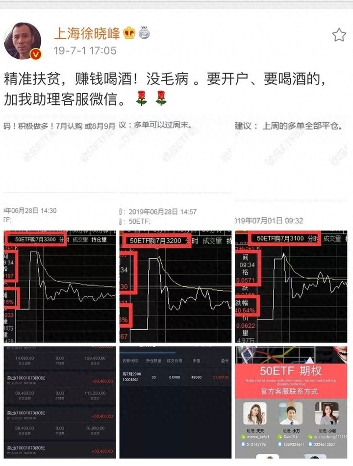 “2019年3月至2020年6月,徐晓峰在他的微博和直播中,宣传他公司和他操作的上证50ETF交易平台,并组建客服团队共同宣传推广非法交易平台。”赵华提供的截图显示,2019年5月、6月、7月、9月,徐晓峰在微博发布了10余次关于50ETF期权广告。