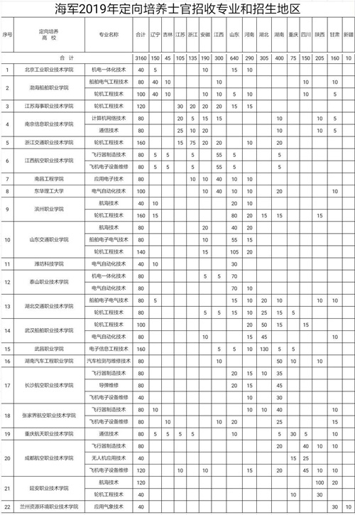 根据军委政治工作部、军委国防动员部、教育部《关于做好2019年招收定向培养士官工作的通知》,海军2019年依托22所地方普通高等学校,面向15个省(自治区、直辖市)计划招收定向培养士官3160人。