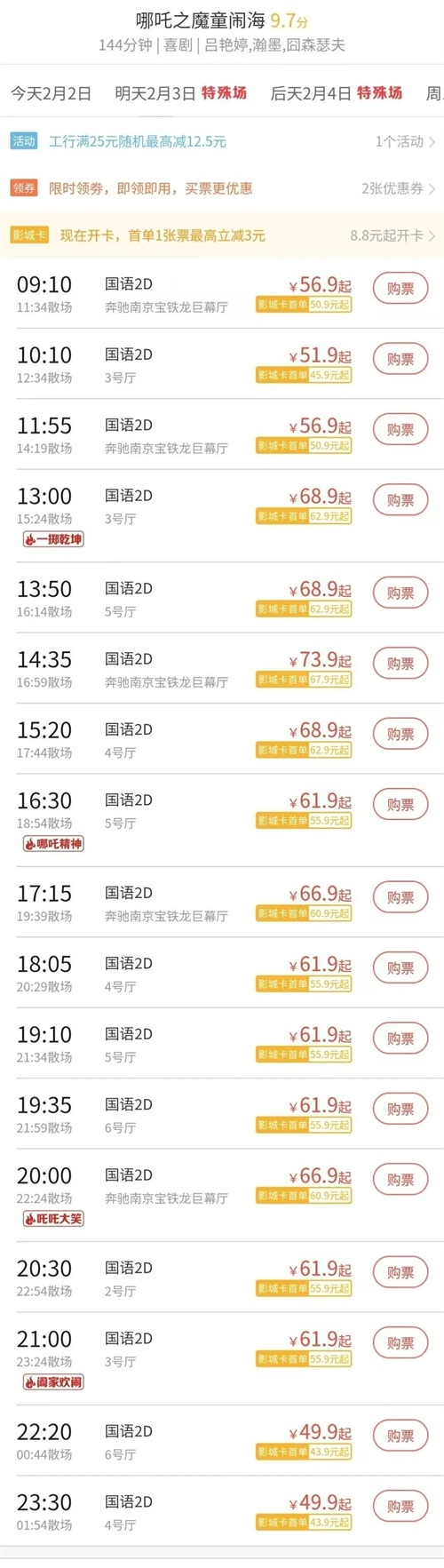 还有网友发帖表示,河南某影院一天排了88场《哪吒之魔童闹海》。网友称,平均10分钟排一场,高峰期5分钟排一场。记者查询发现该影院位于河南鹤壁。