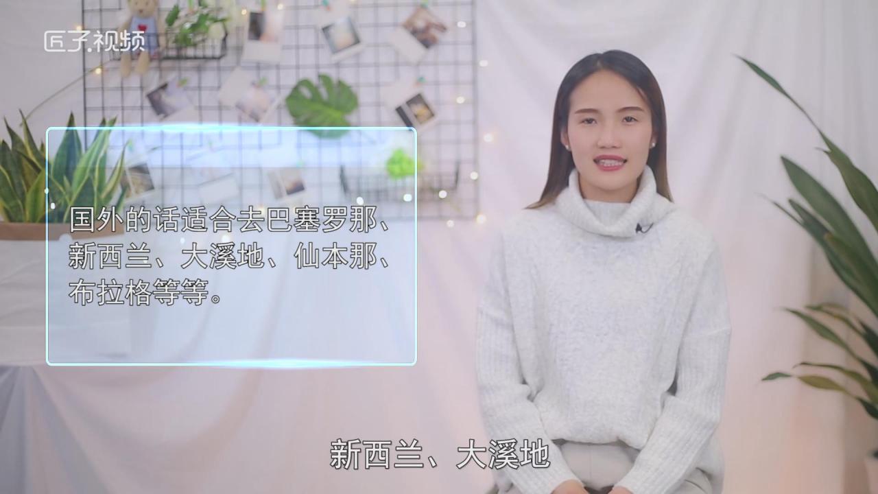 国外的话适合去巴塞罗那、新西兰、大溪地、仙本那、布拉格等等。仙本那位于马来西亚沙巴州南部,拥有白皙的沙滩、高耸的椰树、五彩的珊瑚礁、海水中游曳的鱼群,十分舒适。每年九、十月正值新西兰皇后镇的春天,万物复苏,从皇后镇到山顶一片绿油油的色彩极为美丽。