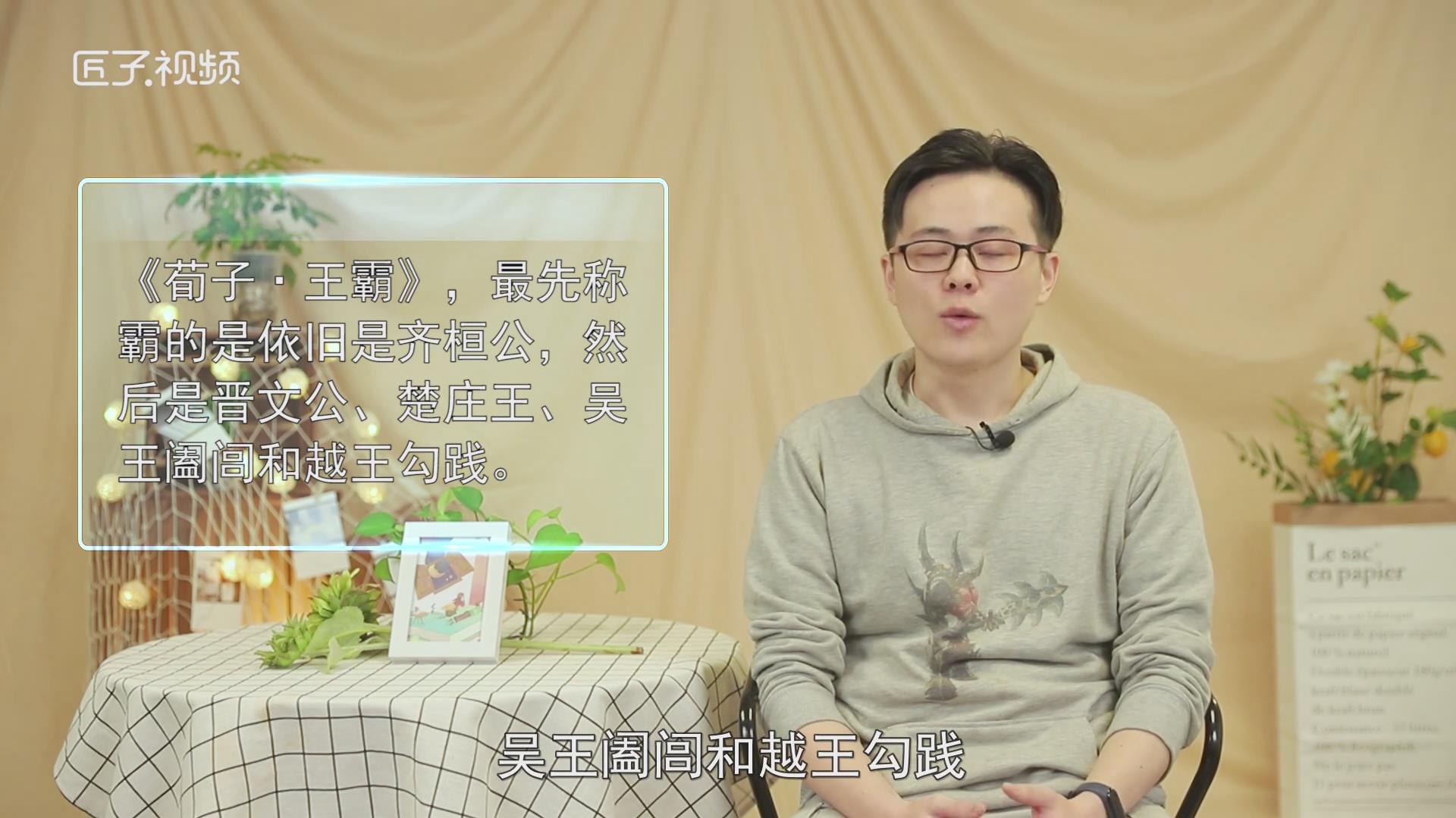 关于"春秋五霸"史上出现过多种说法,其中最具代表性的春秋五霸有两种,一则是记录于《史记索隐》,最先称霸的是齐桓公,然后是宋襄公,晋文公,秦穆公,楚庄王。另一种说法记录于《荀子·王霸》,最先称霸的是依旧是齐桓公,然后是晋文公、楚庄王、吴王阖闾和越王勾践。