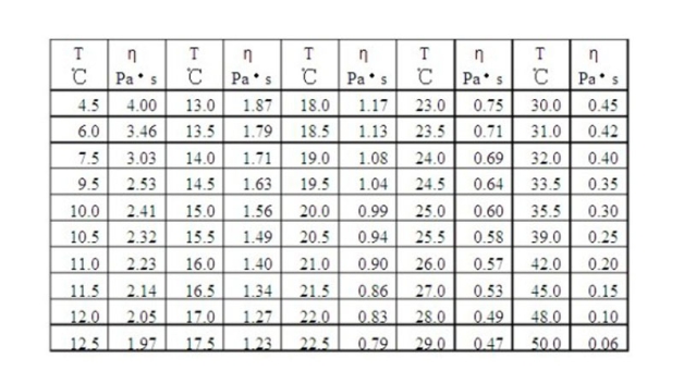 蓖麻油的粘度系数随温度变化很敏感,不同温度下蓖麻油的黏滞系数如下图: