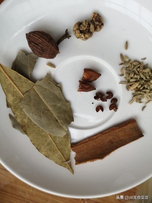 排骨2斤,姜5片,葱白半根,料酒2小勺,桂皮一小块,香叶3片,八角半个,丁香1粒,花椒10粒,草果1个小的,草寇1个小的,小荤香一小撮,白糖1小勺约5克,盐看水多少适量