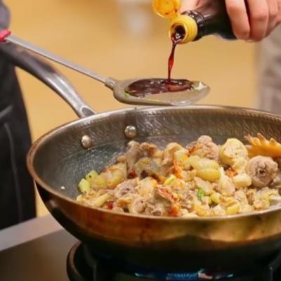 3、锅中放菜籽油,下鸡肉、姜、蒜、葱爆香,用豆瓣酱、“太太乐原味鲜”头道特级鲜酱油、“太太乐”鲍汁蚝油、子弹头辣椒调味。