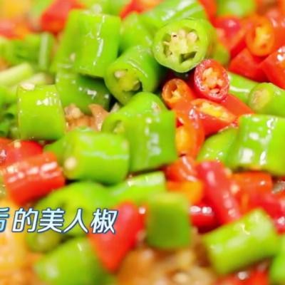 6、倒回锅中,大火收汁后下红油、葱青段,倒入煸炒后的美人椒,出锅撒葱花。