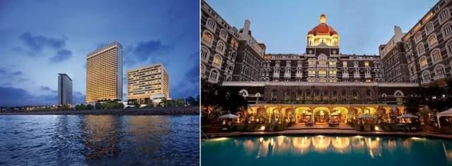 (遇袭前的泰姬·玛哈酒店(右)、奥贝罗伊三叉戟酒店(左))
